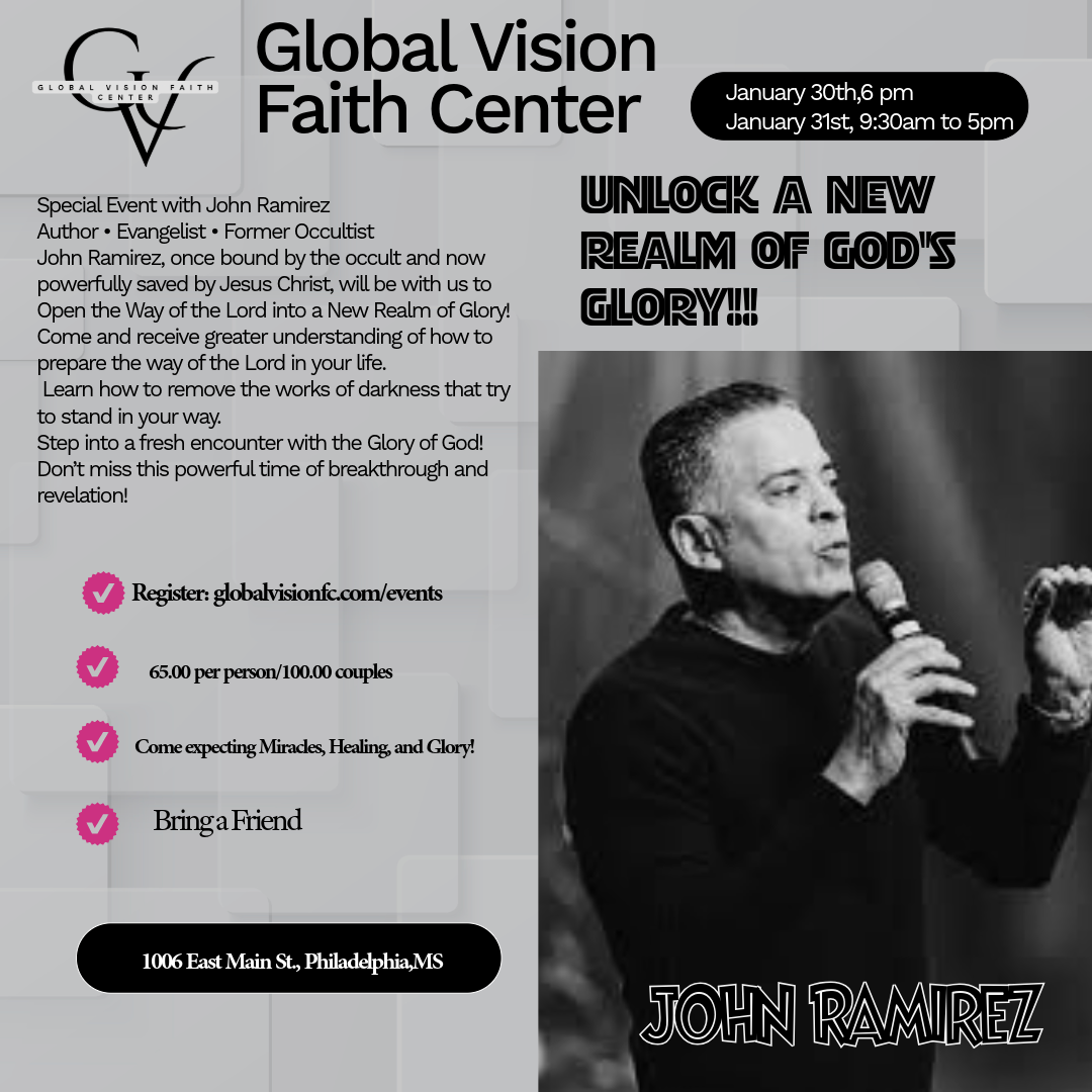 Date: Friday, January 30, 2026 @ 6 PM Saturday, January 31, 2026 @ 9:30 AM to 5 PM Location: Global Vision Faith Center 1006 East Main Street Philadelphia, MS 39350 For more information: Sheila Zehr: 601-389-7757 Email: globalvisionfc@gmail.com MORE
