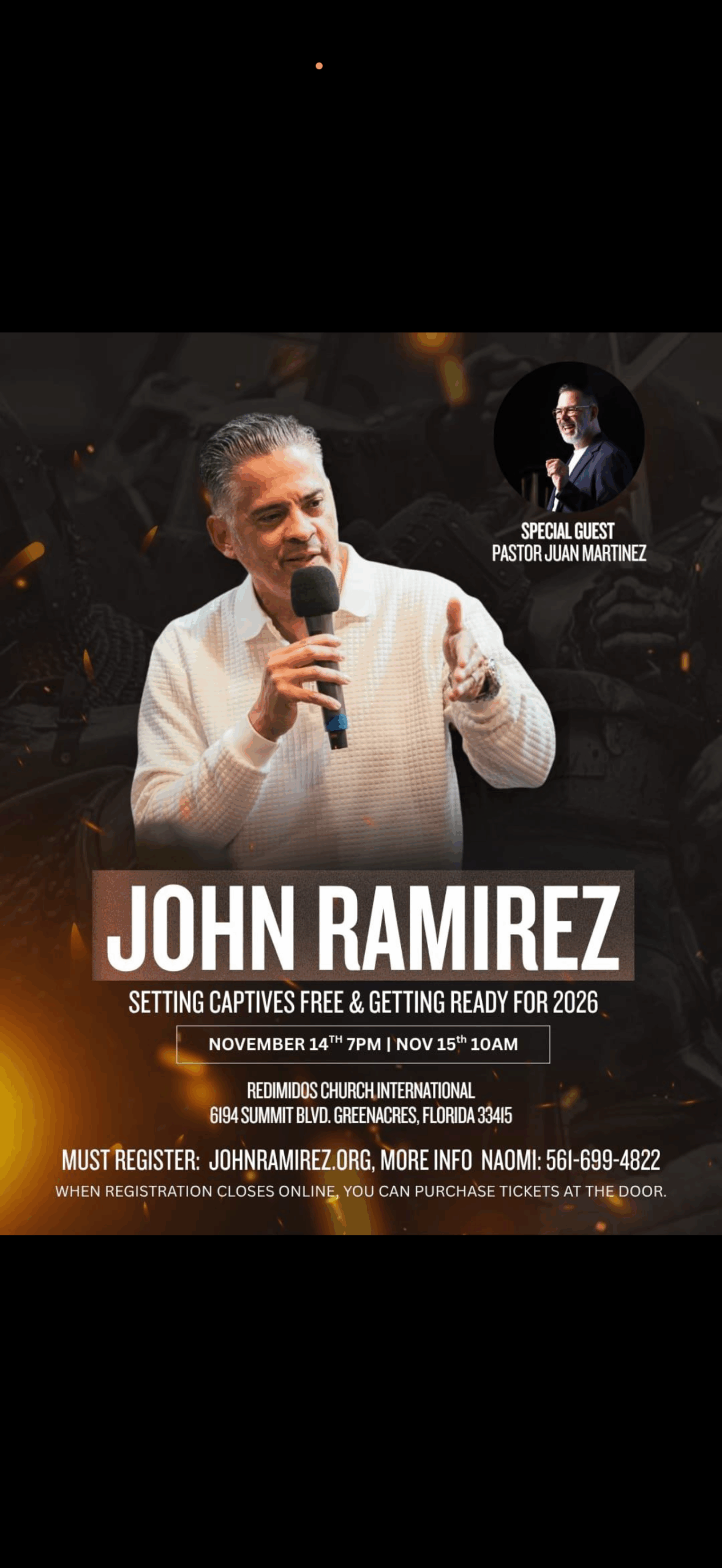 With Special Guest: Pastor Juan Martinez Date: Friday, November 14, 2025 @ 7 PM Saturday, November 15, 2025: 10 AM – Q&A Small Break 3 PM – Powerful preaching and deliverance Location: Redimidos Church International 6194 Summit Blvd. Greenacres, Florida
